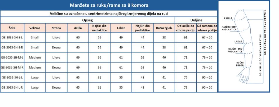 Naša 8ch manžeta za cijelu ruku i rame ima neisprekidani, glatki, jednostrani, graduirani pritisak i protok. Distalno od šake, dužinom cijele ruke skroz do aksile i ramena, te sa prednje i stražnje strane prekriva i drenira pektoralis i zonu oko lopatice. To maksimizira protok limfe iz zahvačenih ili djelomično kompromitiranih limfnih čvorova.